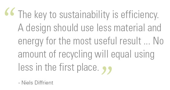 Diffrient was devoted to designs that were simple and effortless to use. Through minimizing complexity in his designs, Diffrient was able to make his products sustainable by using less material and parts. Diffrient consistently considered the environmental impact of his products, stating, “The key to sustainability is efficiency. A design should use less material and energy for the most useful result ... No amount of recycling will equal using less in the first place.”